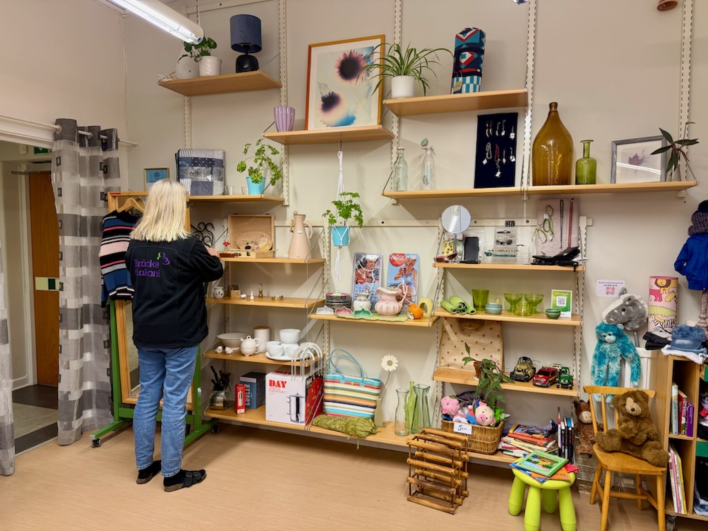 Vi har en återbruksförsäljning där vi tar emot och värderar det vi får in för att sedan sälja dem så att de får leva vidare. Vi tar vara på överblivet material för att tillverka nya användbara eller dekorativa föremål, som vi säljer till externa kunder.