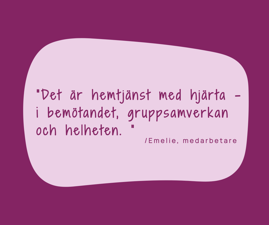 Hos oss möter du engagerade medarbetare med hög kompetens och ett varmt bemötande. Vi arbetar nära dig och strävar efter att du ska känna dig trygg med de personer som kommer hem till dig och stöttar dig i din vardag.