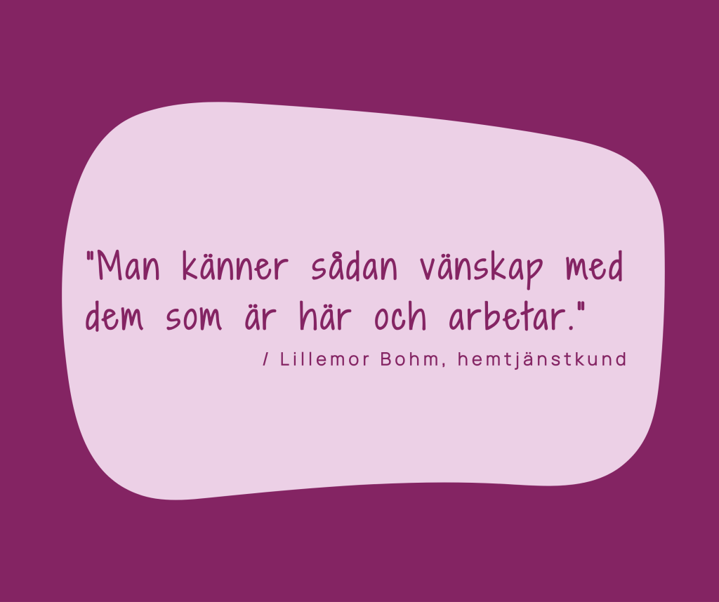 Vi vet att goda relationer skapar trygghet. Därför får du så långt det är möjligt träffa samma personer när vi kommer hem till dig. Våra medarbetare möter dig med vänlighet och respekt för ditt privatliv.