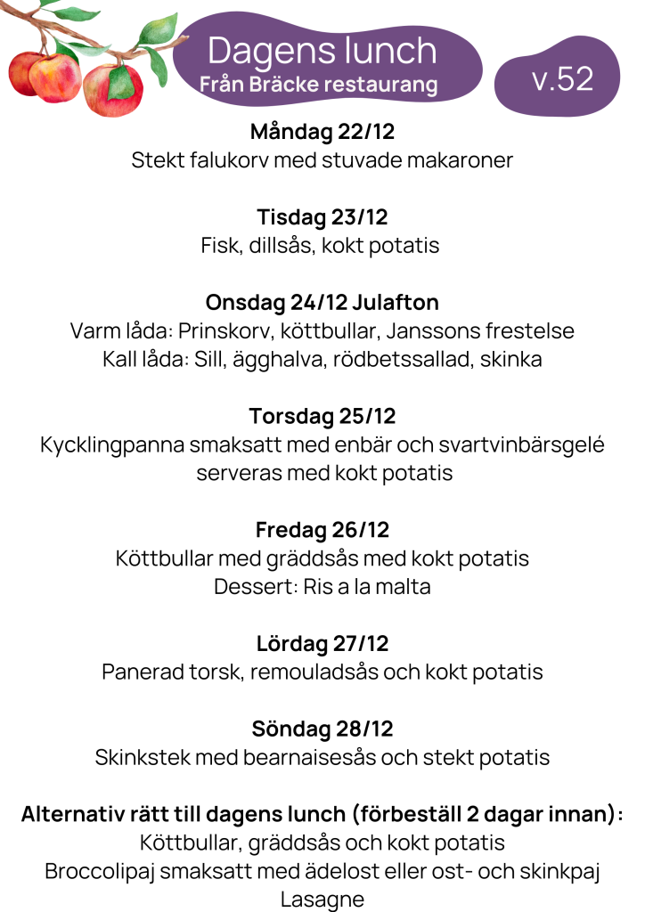 Vi erbjuder samma meny på våra trygghetsboenden Ramstorp, Stolplyckan, Solrosen och Översten. Maten lagas av våra kockar Magnus och Lenny i köket på Ramstorps trygghetsboende. Härifrån packas även maten till dig som abonnerar på lunchlåda via hemtjänsten.
