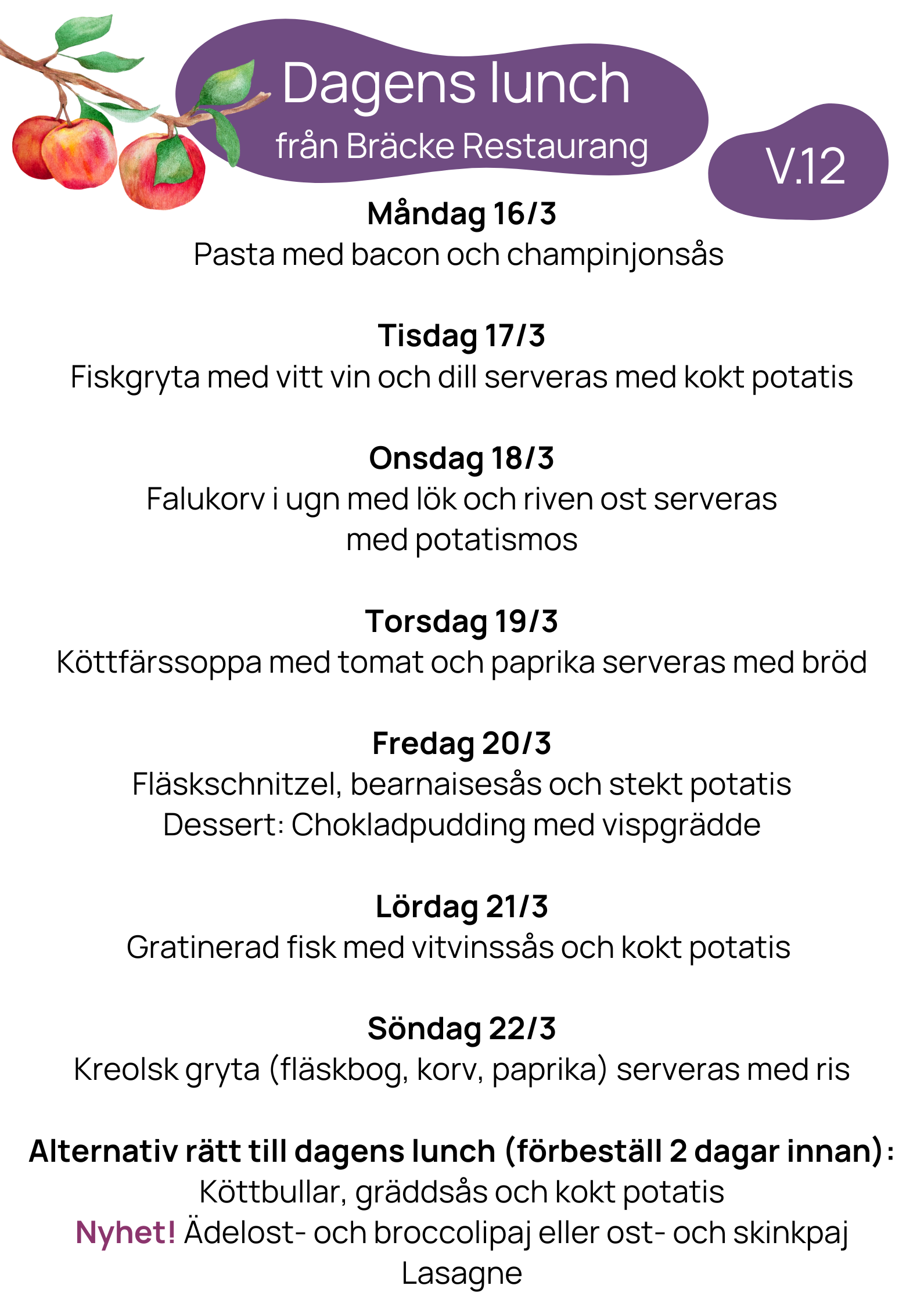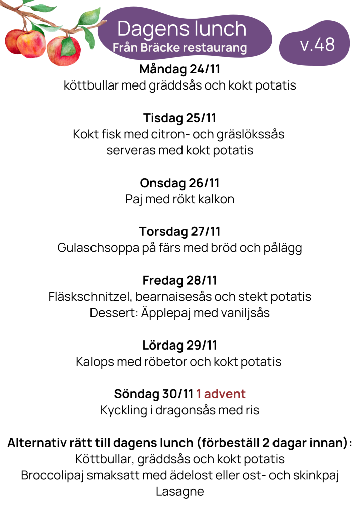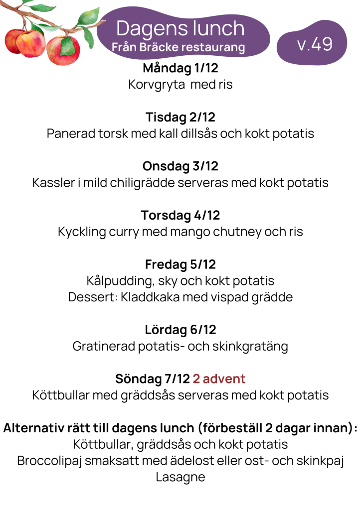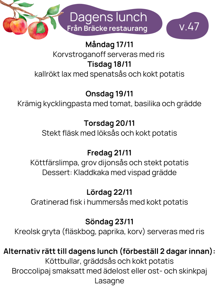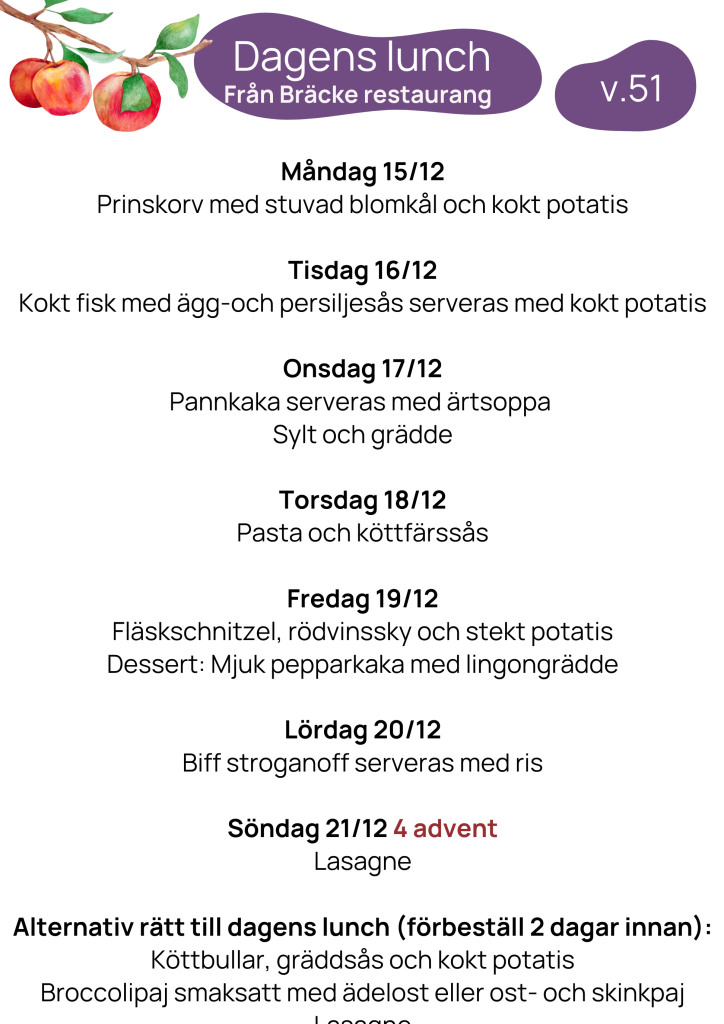 Vi erbjuder samma meny på våra trygghetsboenden Ramstorp, Stolplyckan, Solrosen och Översten. Maten lagas av våra kockar Magnus och Lenny i köket på Ramstorps trygghetsboende. Härifrån packas även maten till dig som abonnerar på lunchlåda via hemtjänsten.