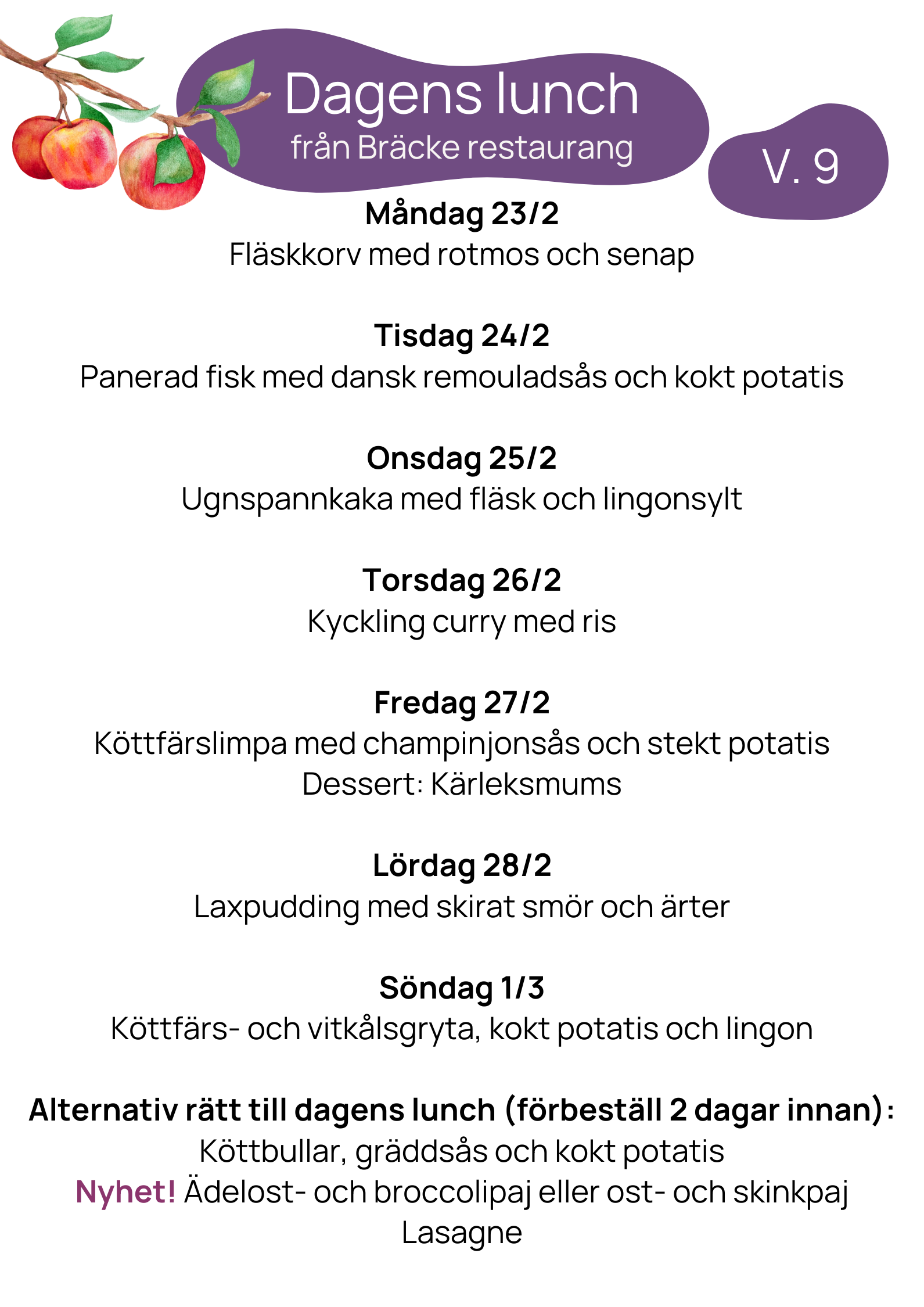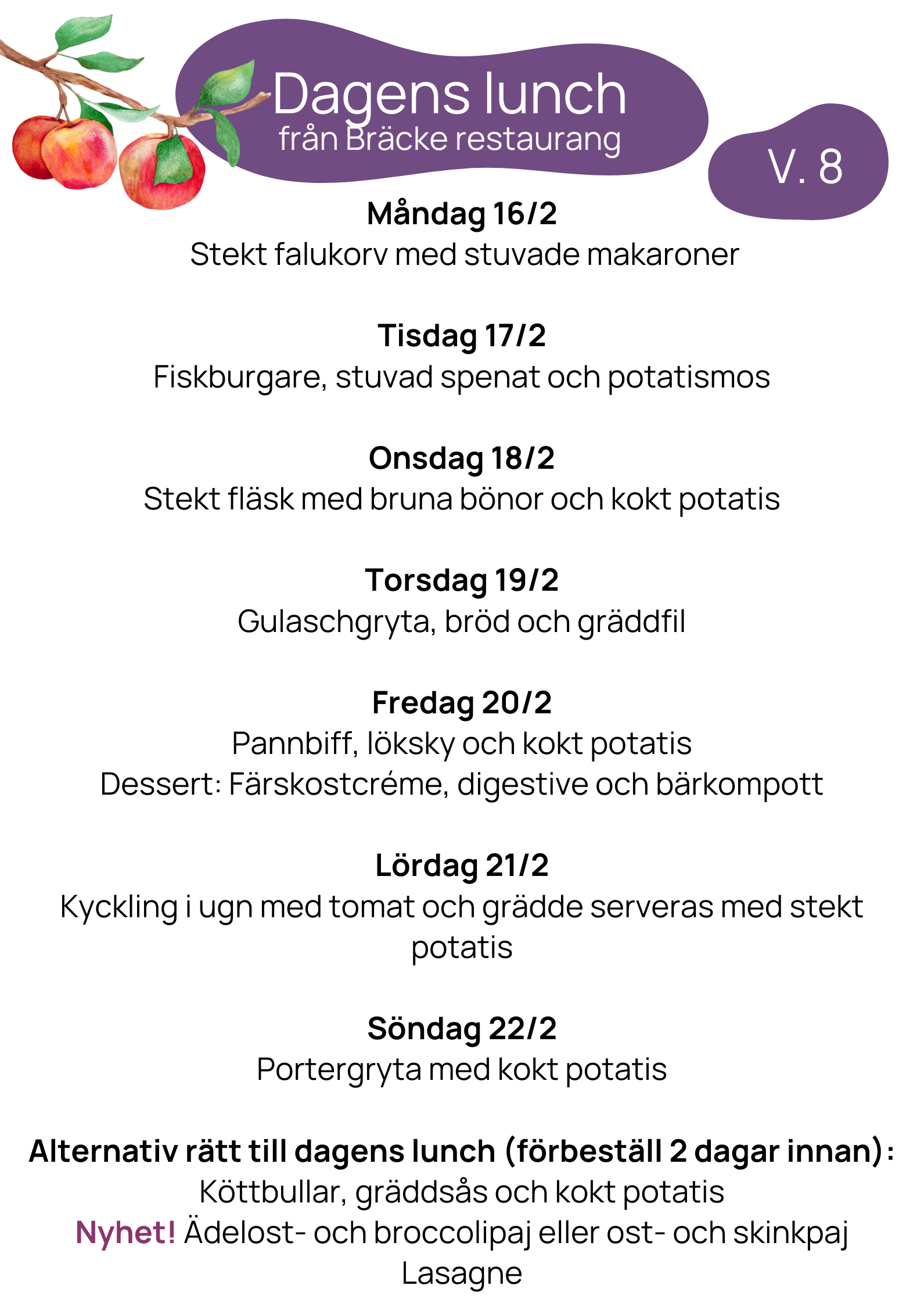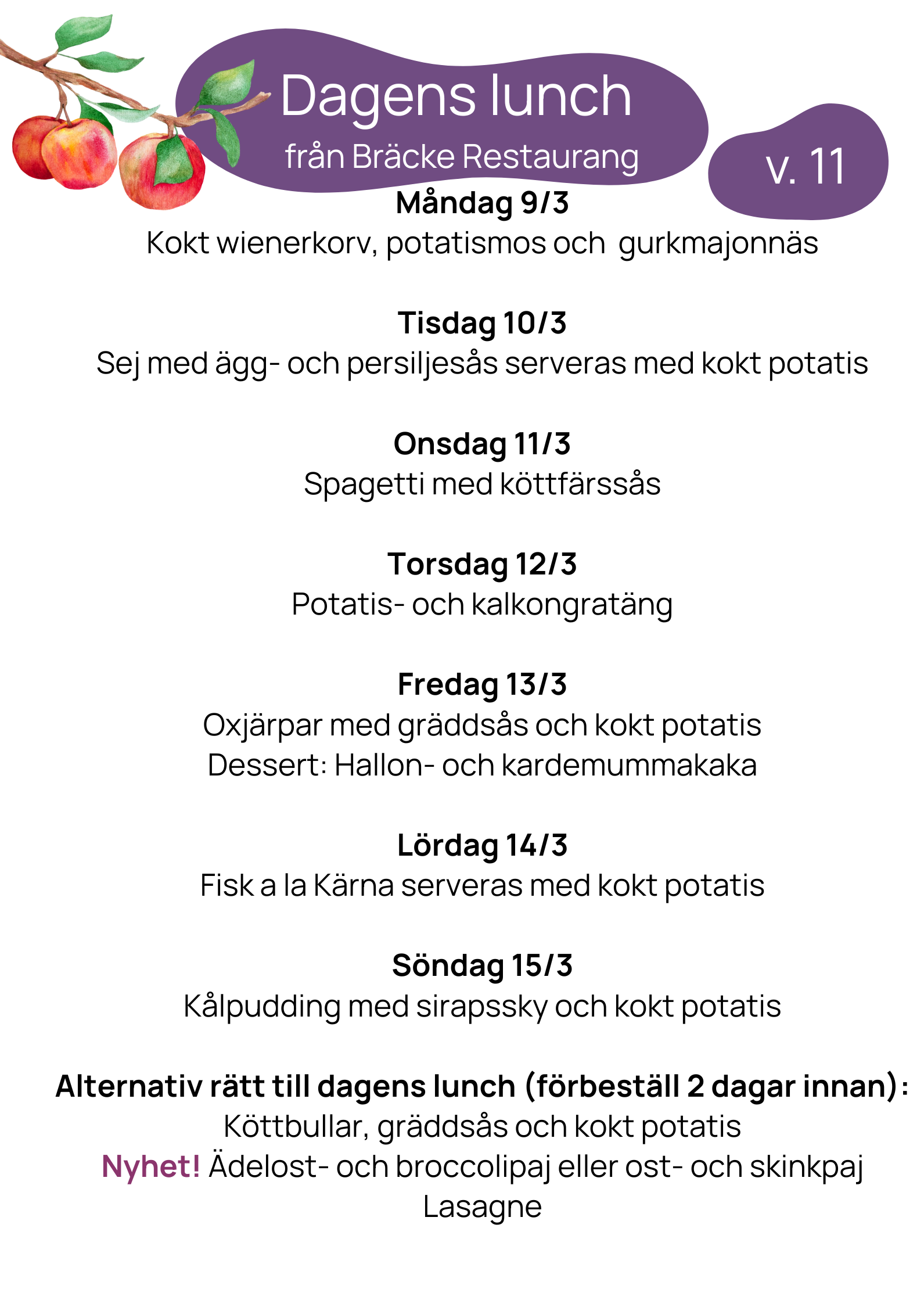 Vi erbjuder samma meny på våra trygghetsboenden Ramstorp, Stolplyckan, Solrosen och Översten. Maten lagas av våra kockar Magnus och Lenny i köket på Ramstorps trygghetsboende. Härifrån packas även maten till dig som abonnerar på lunchlåda via hemtjänsten.