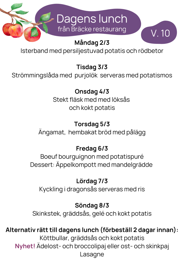 På Bräcke restaurang på Ramstorps trygghetsbeonde lagas mat till samtliga boenden i området samt till dig som har matlåda via hemtjänsten. Som anhörig, hemtjänstkund eller närboende är du också välkommen att äta dagens lunch här.