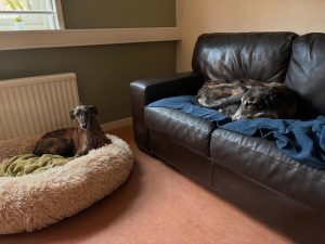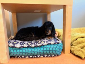 Vila är lika viktigt som aktivitet så det gäller att ha platser som hunden kan och vill, vila på. Vi tycker också att hundarna ska ha lite olika liggplatser så att de kan välja själva vart de vill vila.