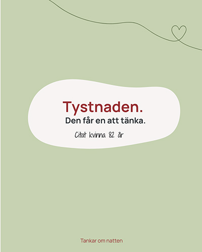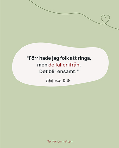 - Lyssna på panelsamtal för att få perspektiv som kan bidra till att du kan minska din egen eller andras ensamhet. Medverkar gör Marina Johansson, kommunalråd i Göteborg med fokus äldrefrågor, Lisa Schjelde, enhetschef vårdboende, Nils Holm, 65 + och anhörig och Anna Jonsgården, projektledare Tankar om natten .